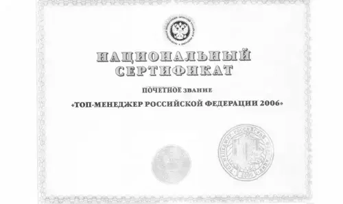 РУКОВОДИТЕЛЬ МАГАЗИНА НАГРАЖДЕН НАЦИОНАЛЬНЫМ СЕРТИФИКАТОМ И ПРИЗНАН ОДНИМ ИЗ НАИБОЛЕЕ ЭФФЕКТИВНЫХ МЕНЕДЖЕРОВ ПРЕДПРИЯТИЙ, ОРГАНИЗАЦИЙ И УЧРЕЖДЕНИЙ РОССИИ. ЕМУ ПРИСВОЕНО ПОЧЕТНОЕ ЗВАНИЕ «ТОП-МЕНЕДЖЕР РОССИЙСКОЙ ФЕДЕРАЦИИ 2006».